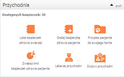 Użytkownik strony ma także dostęp do segmentu przychodnia - z którego chętnie skorzystają np. właściciele lecznic, czy też lekarze weterynarii. To bowiem miejsce, gdzie przechowywać można informacje związane z wizytami pacjentów, historią ich chorób, jak i leczenia. Pierwszą opcją znajdującą się w tym segmencie jest lista książeczek zdrowia, pozwalająca skatalogować książeczki wszystkich pacjentów. Aby dodać kolejną książeczkę wystarczy skorzystać z opcji - dodaj książeczkę zdrowia. Natomiast w celu dodania większej ilości książeczek zdrowia do konta użytkownika należy kliknąć zwiększ limit książeczek zdrowia pacjenta, a następnie wybrać z listy odpowiednią opcję (liczba książeczek). Opcja przypisz pacjenta do swojego konta pozwala gromadzić na profilu usługodawcy swoich pacjentów, a jak wiadomo dobry specjalista ma wokół siebie licznych zainteresowanych. Dzięki narzędziu lekarze przychodni dana firma może dostarczyć swym klientom informacje dotyczące poszczególnych specjalistów pracujących w niej, jak również ułatwić kontaktowanie się z nimi - wystarczy kliknąć dodaj lekarza do przychodni, a następnie uzupełnić dane w formularzu - informacje podstawowe (login, email), oraz informacje o lekarzu (dane kontaktowe, i inne). Niezwykle pomocna jest także opcja dyżury w przychodni - to tutaj użytkownik może wprowadzić dane związane z obecnością specjalistów np. w lecznicy (jaki lekarz, w jakich godzinach, w jakich dniach tygodnia).